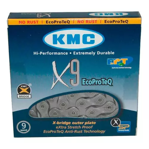 La cadena KMC X-9-E EPT 116 eslabones 9 velocidades está optimizada para bicicletas E-bikes con motor medio y está revestida con el tratamiento anticorrosión EcoProTeQ.