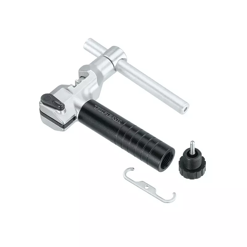 Herramienta de cadena de alta calidad con pasador de émbolo reemplazable para cadenas de una o varias velocidades de hasta 12 velocidades, incluidas las cadenas de pasador hueco Campagnolo de 11 velocidades. El gancho de cadena incluido sujeta los eslabones durante el montaje. Espacio de almacenamiento para el gancho de la cadena incluido y un pasador de émbolo de repuesto.