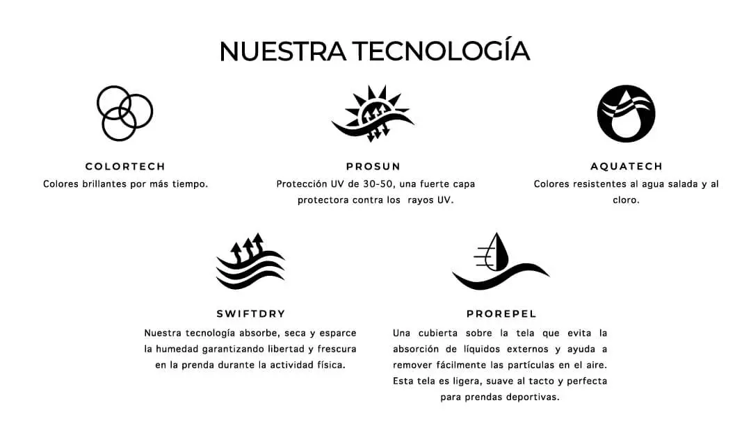 Fabricada con tejidos de última generación, compuestos por un mayor número de filamentos por hilo, lo que permite un tacto más suave y ligero. Composición 81% microfibra de poliéster y 19% elastano. Se utilizan tintas italianas de alta densidad con protección UV FPS +30. Las telas incluyen las tecnologías SWIFTDRY, PROSUN, PROPEL, COLORTECH y AQUATECH