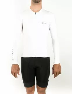 Jersey manga larga para Hombre Color blanco desarrollado con un fit más ajustado, ceñido al cuerpo del ciclista que ayuda a mantener la ergonómia durante todo el recorrido de montada optimizado usando telas con transporte de humedad y secado rápido además que contar con protección UV.
