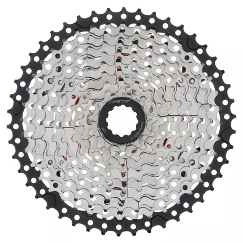 PACHA CASSETTE PARA BICICLETAS DE MTB GW 10 VELOCIDADES, DESDE 46T HASTA EL 11T, CON CUERPO EN ALUMINIO Y PIÑONES EN ACERO, COMPATIBLE CON LA MAYORÍA SISTEMAS DE CAMBIOS DEL MERCADO, CON ANILLO DE SEGURIDAD PARA 40 NEWTONS, SU SISTEMA DE ANCLAJE PRECISO PERMITE UN FÁCIL CAMBIO ENTRE MARCHAS Y SUS PIÑONES PERFORADOS NOS BRINDAN UN MENOR PESO, UN TOQUE DE ESTILO GRACIAS A SU ULTIMO PIÑON DE COLOR NEGRO.