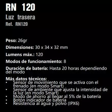 Lumens máx: 120 Modos de funcionamiento: 8 Duración de bateía: Hasta 20 horas dependiendo del modo de uso Resistencia al agua y polvo: IPX6 Peso: 26 gr