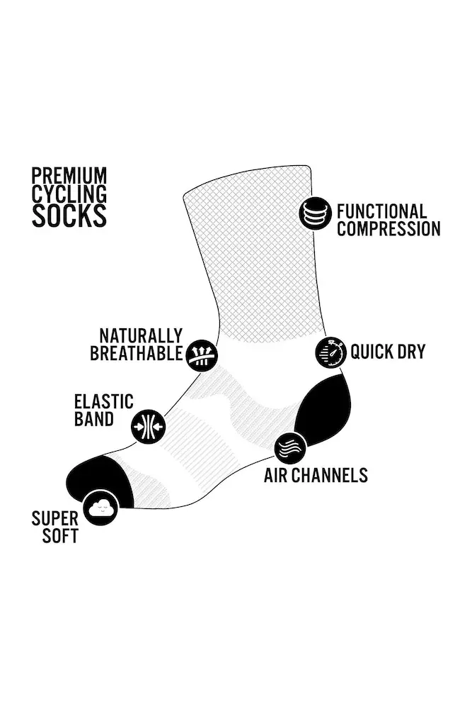 Calcetín deportivo, sublimado, con compresión media. Beneficios Funcionales: Mejora la oxigenación muscular, evita la fatiga excesiva y los calambres, aumenta el retorno sanguíneo y mejora la recuperación.