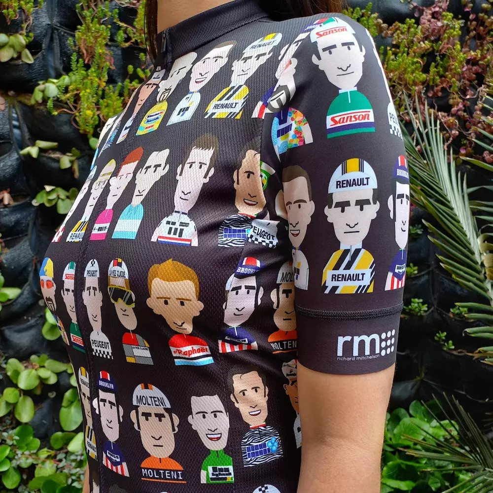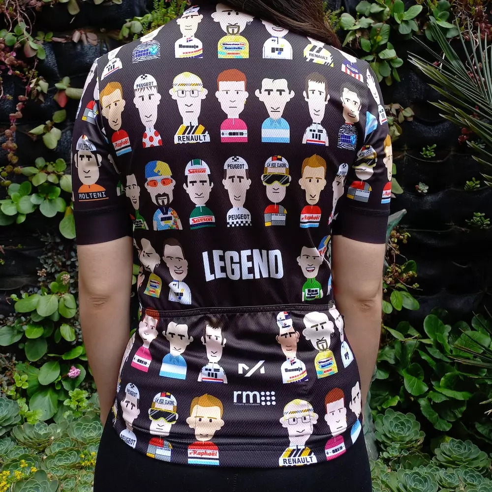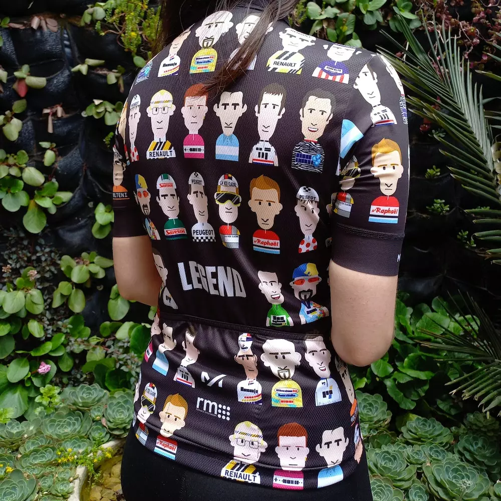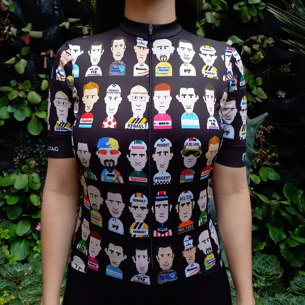 Camiseta / Jersey / Maillot de ciclismo marca Milltag, modelo «Legends Jersey», para mujer. Este espectacular jersey de edición limitada fue diseñado por el reconocido artista inglés Rich Mitch, el cual hace homenaje a algunas de las grandes leyendas del ciclismo mundial incluyendo a Merckx, Hinault, Induráin, Pantani, Fignon, Kelly, Millar y LeMond, entre muchos otros! A cuántas de estas leyendas reconoces? Este es un jersey de alta tecnología basado en la línea «Club» de Milltag, hecho a mano en Eslovaquia con telas de la compañía italiana Miti SpA. Viene con tres bolsillos en el dorso, un bolsillo impermeable con cremallera para objetos de valor, lados en tela «Carbonmesh», mangas y puños en «Lightweight Stretchfit», y cinta reflectiva. Con un ajuste un poco más relajado, el Club Jersey de Milltag está diseñado para el ciclista contemporáneo.