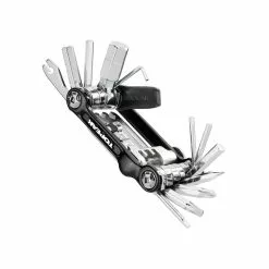 Una mini herramienta de precisión de metal completo de 23 funciones hecha para manejar cualquier reparación en carretera o camino. Las llaves Torx T10 y T25 simplifican el trabajo del freno de disco hidráulico. Incluye herramienta de ajuste automático y una bolsa de neopreno. La herramienta perfecta para carreras de resistencia, entrenamiento y giras. No compatible con cadenas de pernos huecos de 11 velocidades Campagnolo.