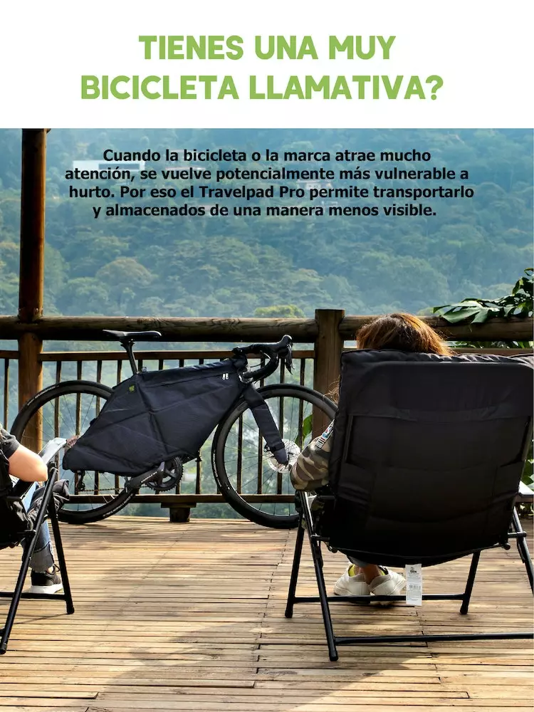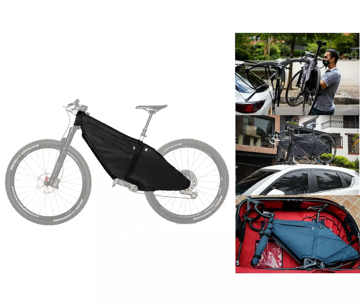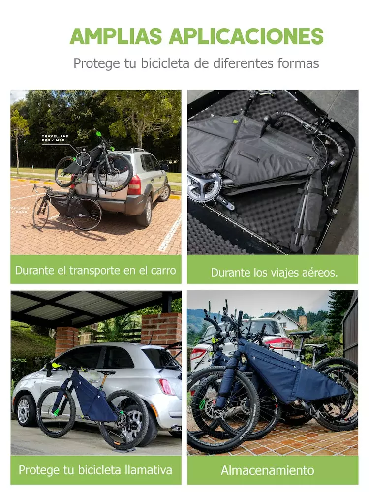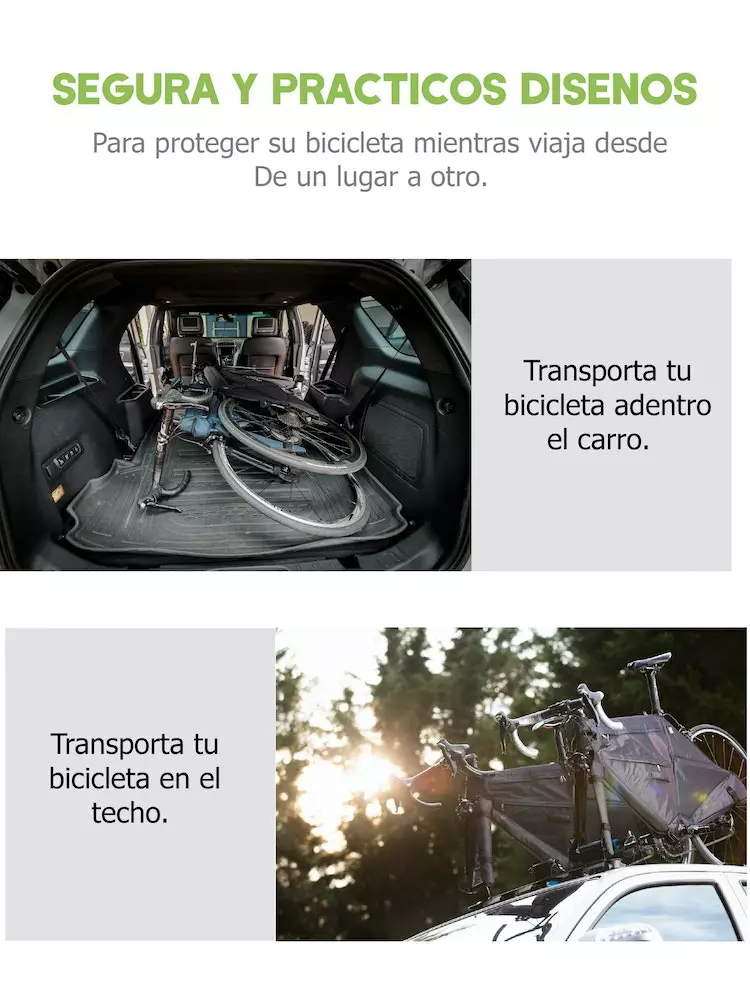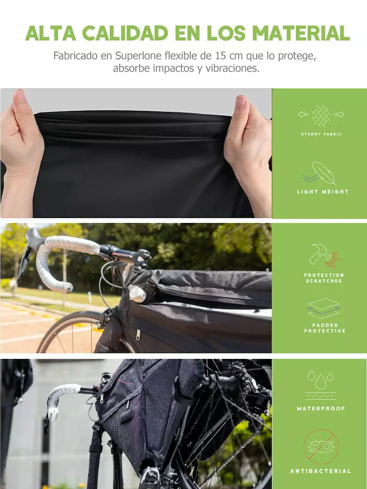 Se ajusta a la forma de la bicicleta, evitando rayones, daños superficiales, es ligero, delgado, fácil de transportar y se puede ajustar a cualquier maleta o espacio. Está fabricado con tela de poliéster a prueba de agua, es resistente a los golpes, al estiramiento y es antibacterial. En su interior tiene Superlone flexible que lo protege, suaviza los impactos y las vibraciones.