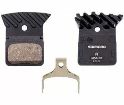 Pastillas de freno Shimano L05A-RF compatibles con frenos 105, Ultegra y Dura-Ace de carretera. Destacan por su calidad, durabilidad y, especialmente, por su mínimo ruido y la potencia de frenado que generan cuando friccionan con los discos; cualidad principal de las pastillas orgánicas.