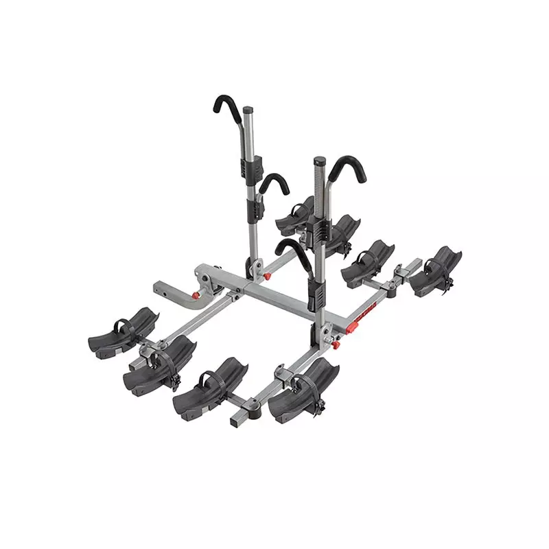 Transporta hasta cuatro bicicletas independientemente del diseño del cuadro, la suspensión o el tamaño de la rueda, incluyendo bike fat y bicicletas para niños con guardabarros. Se convierte de un portabicicletas de 4 en un portabicicletas de 2 en minutos y tiene la posibilidad de abatirse con bicicletas cargadas para acceder a la parte trasera del vehículo y de plegarse cuando no está en uso. Cerradura de enganche SKS incluida. Se adapta solo al receptor de enganche de 2″.