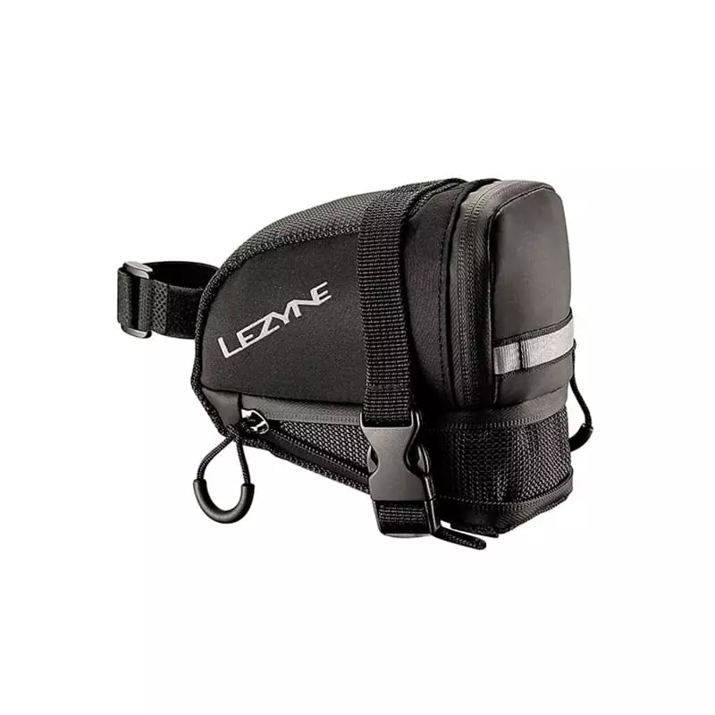 Bolsa portaherramientas extensible en forma de cuña. El sistema de hebillas se fija a los rieles y a la tija del sillín. Construcción de nailon tejido duradero. Bolsillos organizativos internos etiquetados. Los logotipos reflectivos y el lazo aumentan la visibilidad nocturna. Cremallera resistente al agua con tirador grande.