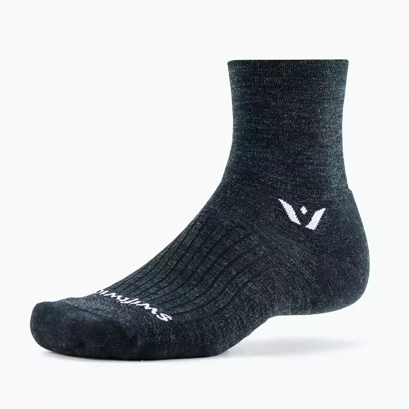 Medias de ciclismo marca Swiftwick, modelo «Pursuit», en color gris de cuatro pulgadas. Las medias Pursuit están elaboradas con lana merino y con un talón y puntera reforzados para maximizar la durabilidad. La fibra natural de lana merino de calibre fino proporciona calor en invierno y refresco en verano, además de absorber la humedad sin perder la capacidad de regular la temperatura. Produce una sensación suave y sin picazón desde el puño hasta la punta. El merino es una fibra natural, renovable y se obtiene de forma sostenible.