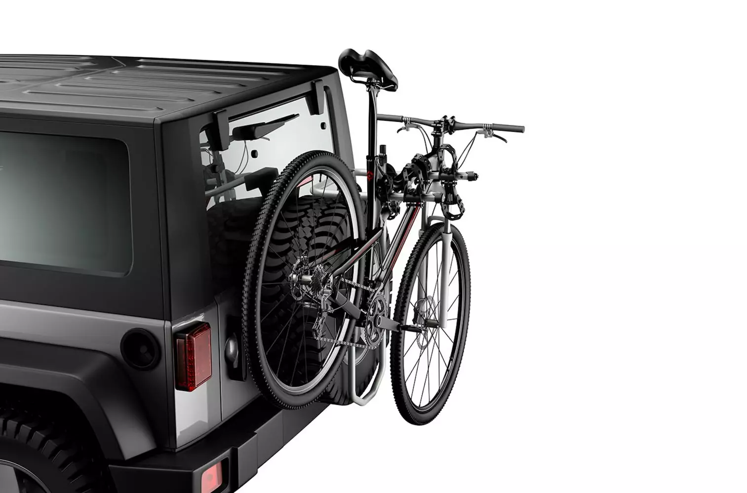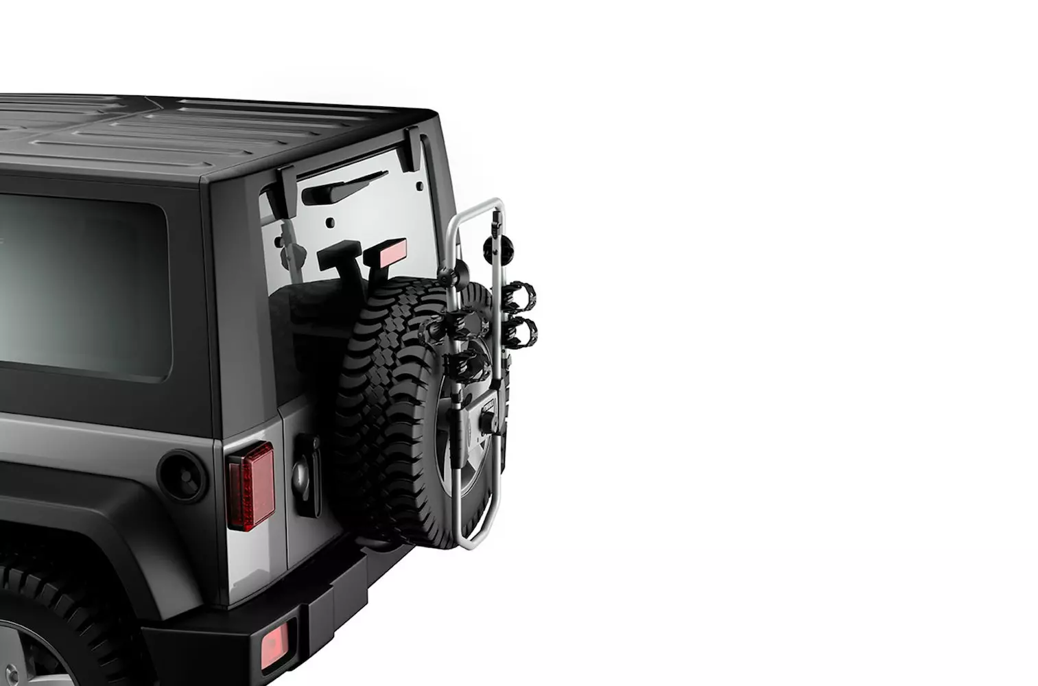 Portabicicletas resistente de tipo colgante que se monta al neumático de repuesto con un adaptador para ajustarse a neumáticos estándar y de tamaño grande (para 2 bicicletas).